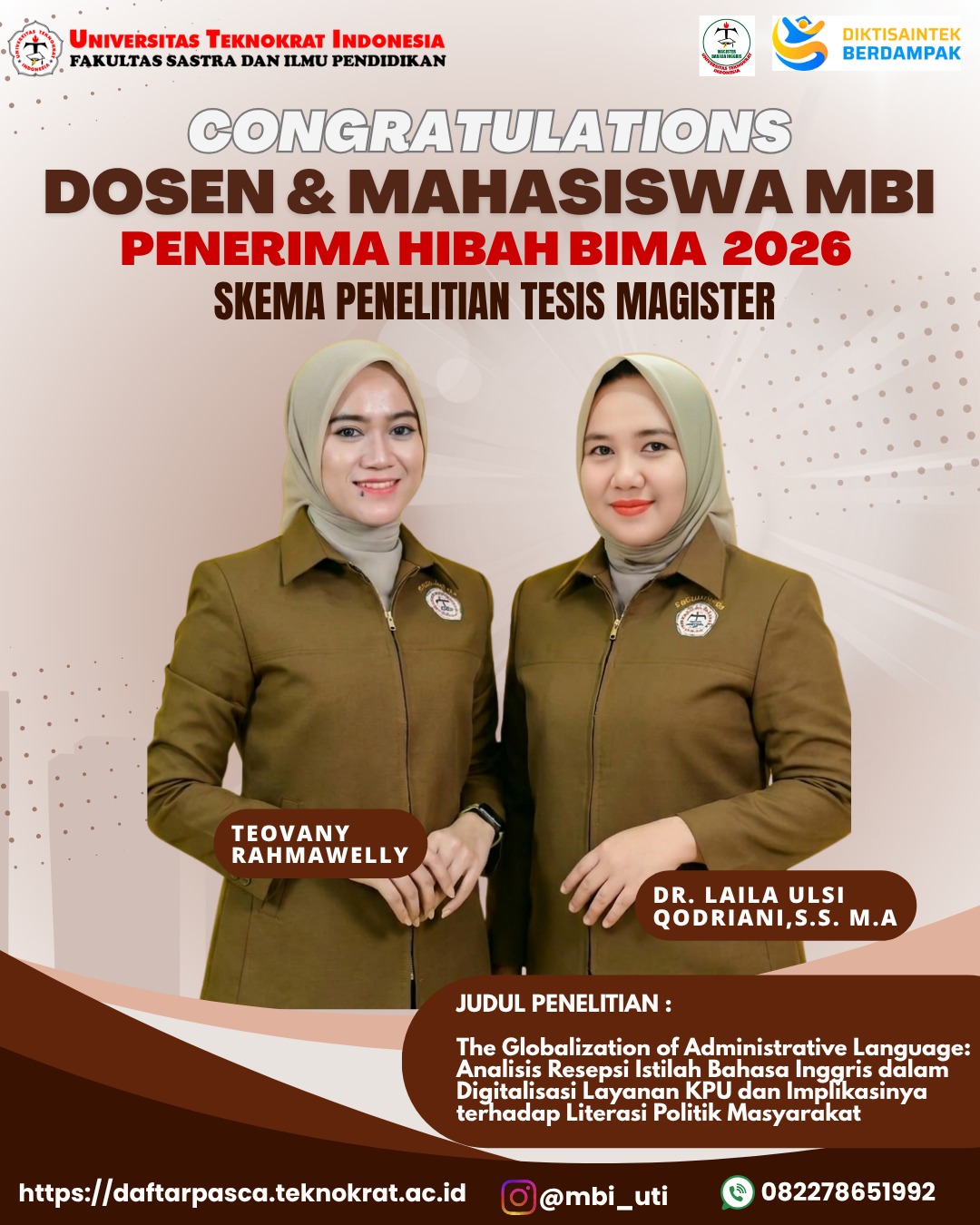 Bersama dosennya, Assoc. Prof. Dr. Laila Ulsi Qodriani, S.S., M.A., ia berhasil meraih pendanaan hibah penelitian BIMA (Basis Informasi Manajemen Penelitian dan Pengabdian kepada Masyarakat) untuk Penelitian Tesis Magister dari Kemdiktisaintek tahun 2026. Demikian keterangan yang diterima Lampungku.com Selasa (14/4/2026).